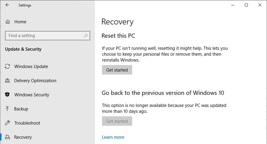 تقوم طريقة الإصلاح هذه بإعادة الكمبيوتر إلى صورة الاسترداد المضمنة (عادةً ما يتم إنشاؤها عندما يحصل الجهاز على صورة Windows الأولية الخاصة به ويقوم بإنشاء تخطيط قرص النظام / بدء التشغيل الأصلي) أو إلى صورة Windows حديثة ونظيفة تم تنزيلها من خادم Microsoft. لشيء ذي إمكانات قم بإجراء تغييرات كاملة على جهاز الكمبيوتر الخاص بك، مباشرة من حسابك الإداري. انتقل إلى الإعدادات> التحديث والأمان> الاسترداد، وانقر فوق زر البدء ضمن إعادة تعيين هذا الكمبيوتر.